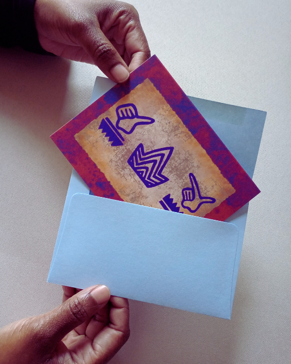 The Zulu people of South Africa have a rich tradition of using graphic symbols to convey important ideas and words, a practice rooted in ancient times. These symbols were shared with healers, elders, and women, preserving their knowledge as sacred. Symbol-writing communicated personal matters, such as love declarations or requests for help. Often etched on calabashes, message sticks, or woven into mats, these symbols were also displayed on drums and pottery. The pictographs on this notecard convey the timeless message: "I Love You," inviting exploration of Zulu symbolism and honoring their cultural heritage.