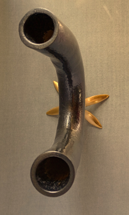 Curly-handle dipper gourd, wood, metal leaf, and brass,