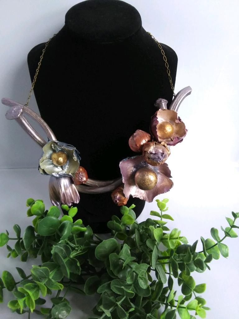 Materials: Gourd, dried seed pods, gourd stems, gold leaf, arlylic paint, water-based sealant, and metal chain